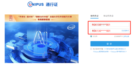 试测与正式比赛的账号密码均为该语种英文首字母(大写)+GK+报名手机号。如下图所示: