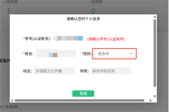 3、确认个人信息,选择“性别”后,点击“完成”。”