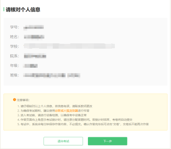 6、核对个人信息,阅读考试说明。此页面个人信息与真实信息不完全相符(为公开赛特殊设置),仅确认姓名为真实姓名,院系为真实学校即可。