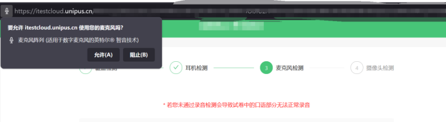7、完成键盘、耳机、摄像头检测。如浏览器未设置允许使用,请注意页面弹窗提醒。弹窗“选项”要选择“允许”。