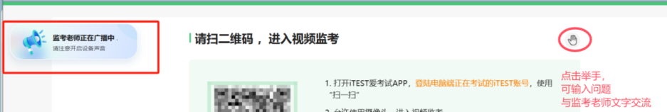 2、如考中有问题需与监考老师沟通,可点击下图“举手”图标,输入问题进行咨询。