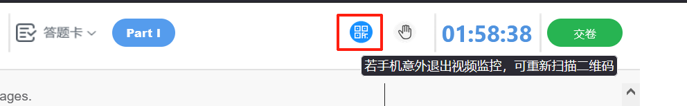 3、如考中手机意外退出视频监考,点击下图二维码图标,重新扫描进入视频监考。